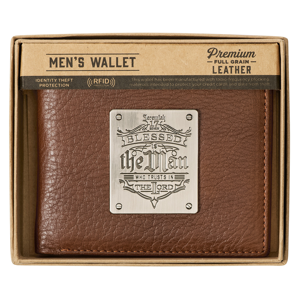 The rich timber spice brown leather wallet has a matte, textured look to it. A rugged silver metal plaque is securely attached to the wallet's front with four studs and laser engraved with the scripture, Blessed is the man who trusts in the LORD, Jeremiah 17:7