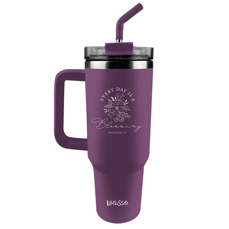 Count your blessings with this beautiful and practical “Blessing” Stainless-Steel Mug w/Straw by Kerusso® in Purple. A beautiful reminder that we can experience the blessings of God daily. Take this attractive mug along for hydration on the go.