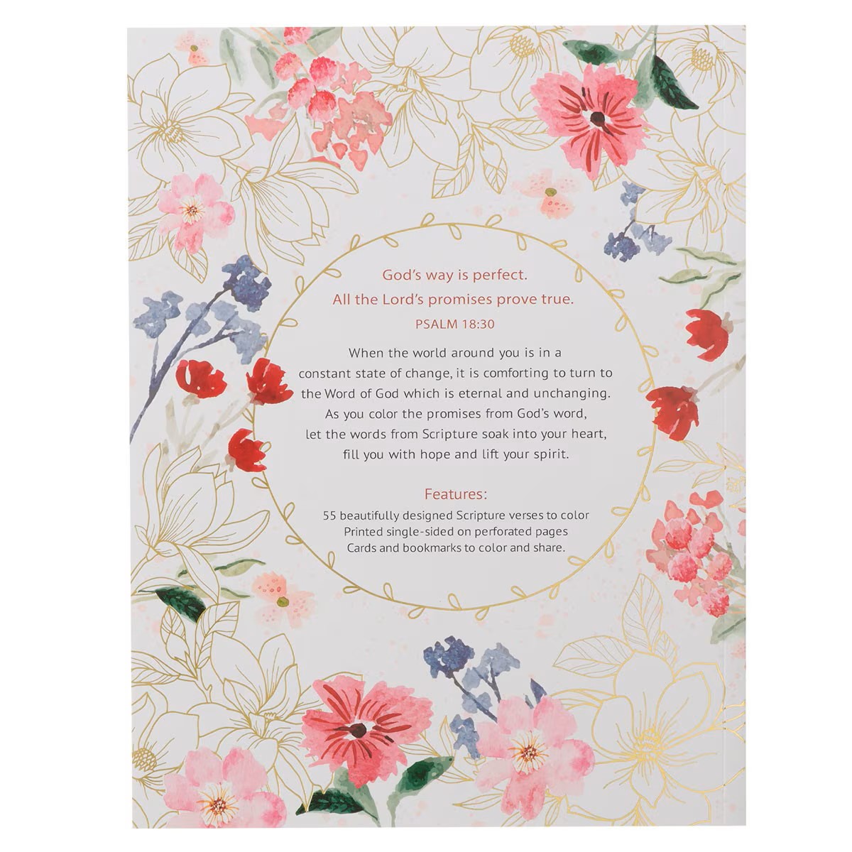 The coloring book's cover is made of heavy-duty cardstock. Inside are 55 beautifully designed single-sided printed Scripture verses to color. Perforated pages make creations easy to remove. Illustrations include full-page line drawings, cards, and bookmarks you can color and share.