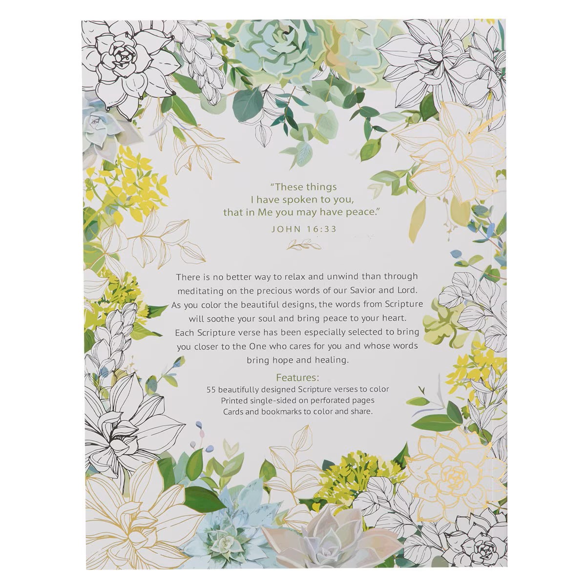 The coloring book is bound in heavy-duty stock. It contains 55 beautifully designed Scripture verses to color. The verses are printed single-sided on perforated pages that are easy to remove. Some of the illustrations include cards and bookmarks you can color and share.