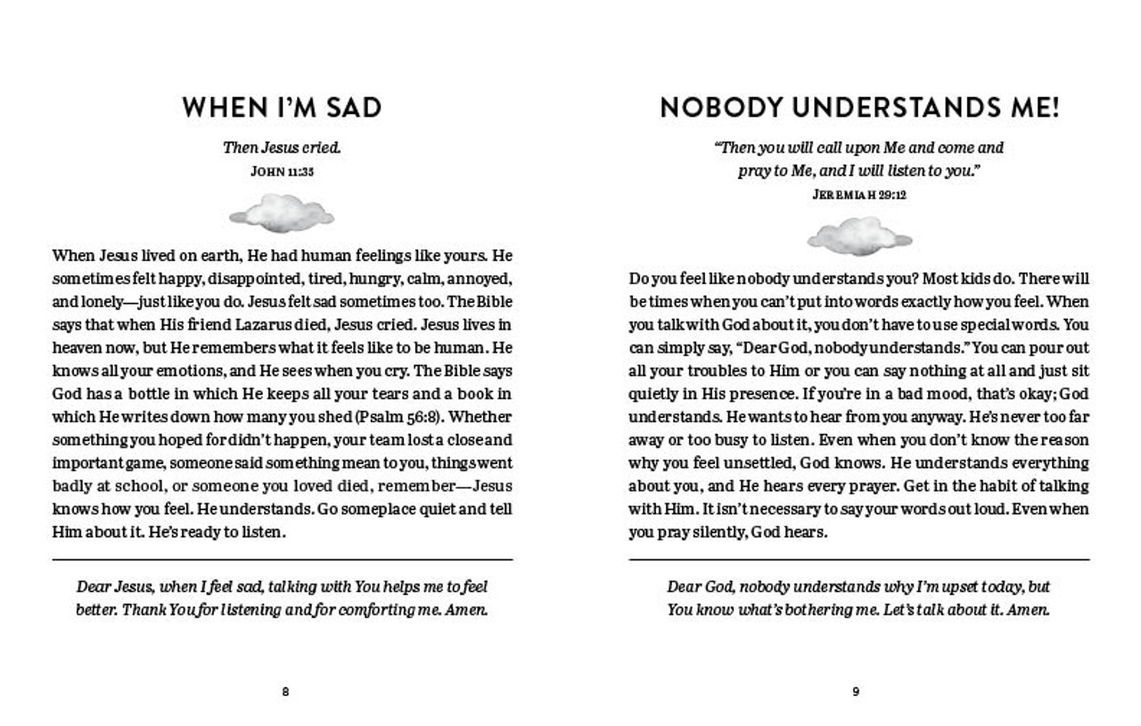 This encouraging book is a great reminder for boys to give all their worries and cares to God. Dozens of devotions and prayers offer the biblical reassurance that God is big enough to handle everything—and He has good plans in store for the future. Topics include: Trouble with Friends, Worries about Tomorrow, Scary Things, The "What-Ifs," Does God Hear Me?, and more.