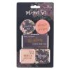 The coordinating epoxy-coated magnets follow a pink and charcoal grey floral theme. The set contains one rectangular magnet, two square magnets, and two round magnets.
