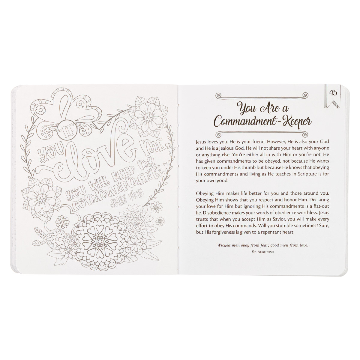 The covers of the small paperback devotional are decorated with a frame of flowers, just ready to be shaded in any colour you desire. The title and subtitles are presented in black block letters accented with pink scripted letters.