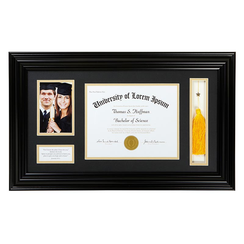 Each frame contains a place for a tassel, a 4" x 6" photo and an opening for the diploma, all to be easily inserted. Hanger attached.