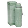 The exterior of the water bottle is powder coated in a scratch-resistant finish with a smooth feel. The twist-off lid is covered in the same finish and has a silicone seal to prevent leaks. A 1.5-inch mouth opening is wide enough to accommodate ice cubes or bottle brushes for cleaning. A grey rim separates the cap from the bottle's body and sports a woven cord loop with a grey plastic finger hook that frees up your hands when carrying it. As with all water bottles, hand-washing with soap and warm water is best. The water bottle comes packed in a full-colour printed tuck-top gift box that is easy to wrap.