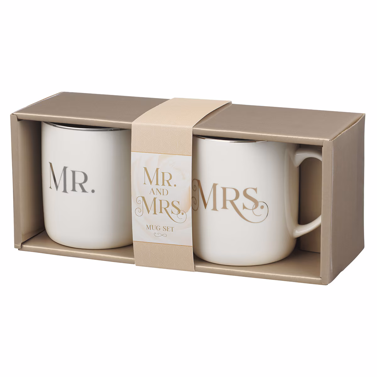 Let the Mr. & Mrs. White Ceramic Coffee Mug Set warm the couple’s hearts as they sip from the coordinating mugs. They can enjoy their favourite hot beverage while reflecting on their life together and be encouraged by Ecclesiastes 4:9 - Two people are better than one, for they can help each other succeed.