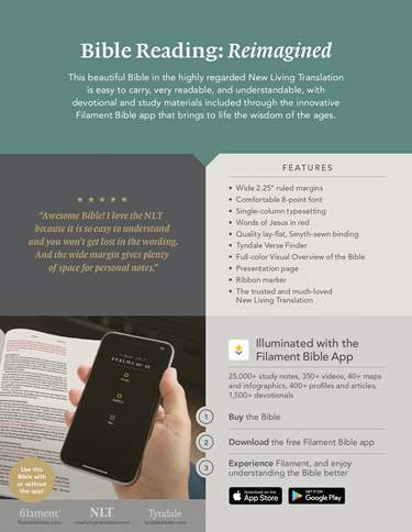 The NLT Wide Margin Bible, Filament-Enabled Edition is the only complete text Bible designed for journaling that has access to the Filament Bible app, which features thousands of study notes, devotionals, videos, reading plans, and more!