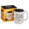 The glossy black interior of the ceramic coffee mug forms a stark contrast to its creamy white exterior, where the sentiment is presented in a black typographical design framed with an ornate gold-foiled frame.