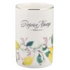 The base of the white ceramic vase is encircled with a lemon branch design that showcases yellow lemons, green leaves, and pink blossoms. The sentiment is screen-printed above the design in scripted blue letters.