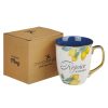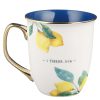 The white ceramic mug is decorated with bunches of yellow lemons that dangle from the top and rise from its base. The sentiment is screen-printed on the front of the mug in blue scripted letters.