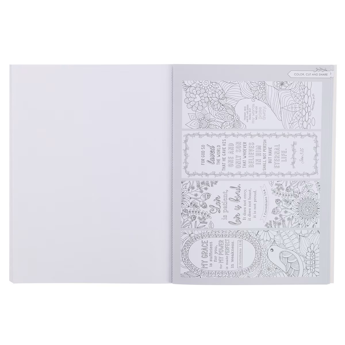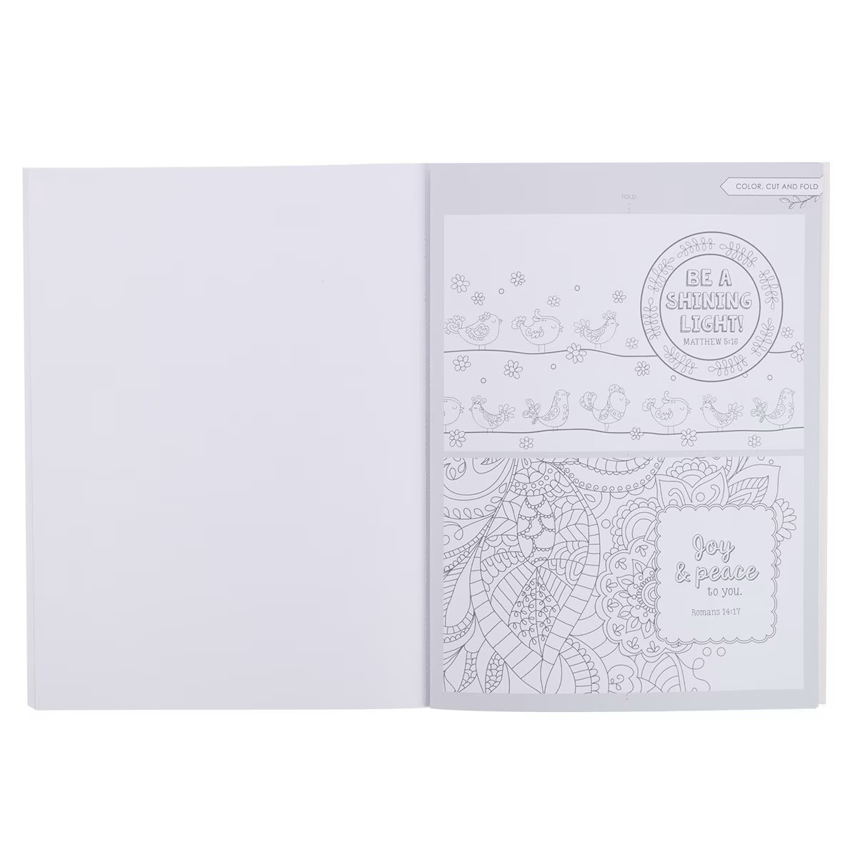 The one-color interior pages feature line drawings of select Scripture verses designed to bring joy and comfort to your heart. In addition to the line drawings there are 6 bookmarks, 8 small and 6 large cards to color, cut out, and share. Use your favorite pencils, gel pens, or paint to color the designs on the perforated pages and then tear them out and display them in a special place.