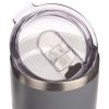 The grey exterior is framed by two stainless steel bands—one at the top and another at the bottom. The interior is double-wall insulated and will keep your drink at a steady temperature for at least 24 hours —a perfect way to stay hydrated during the day. Leave the mug on any surface without worrying about water stains because the double-wall insulation keeps condensation from forming on the outside of the travel mug. A clear plastic lid with a silicone ring fits snuggly into the mouth of the mug, and a retractable sip hole cover with a raised edge prevents any spills or leaks. The stainless-steel travel mug holds 18- fluid ounces.